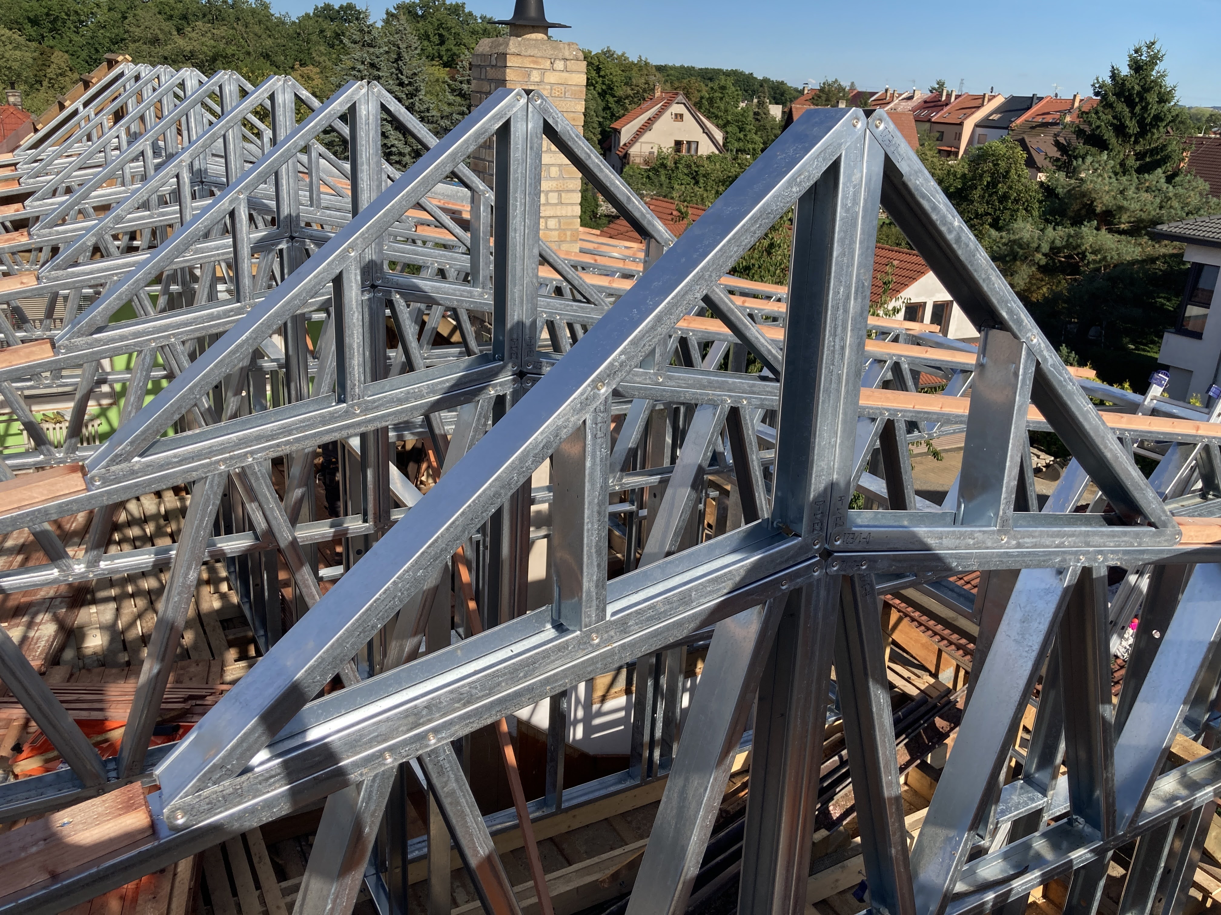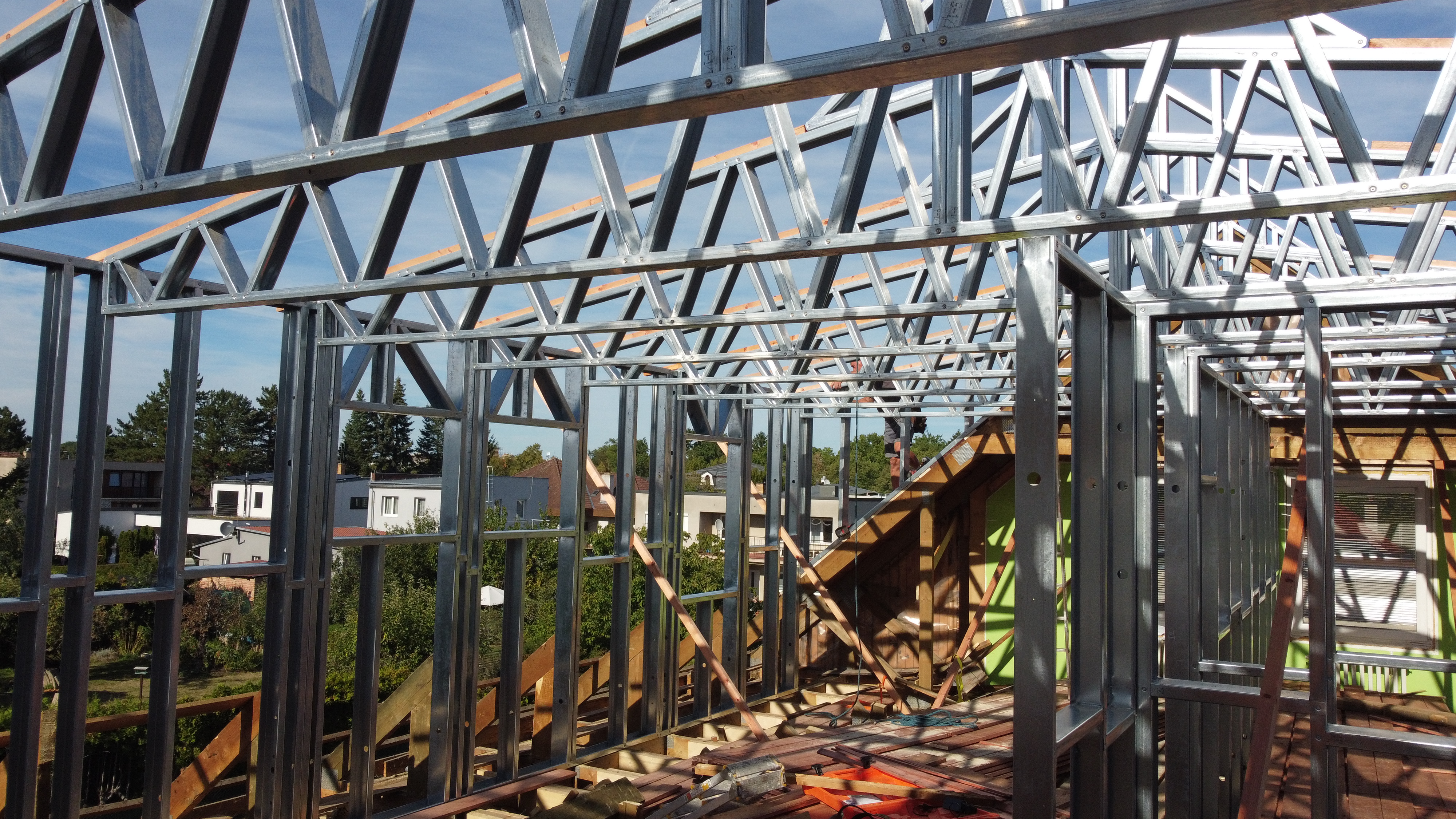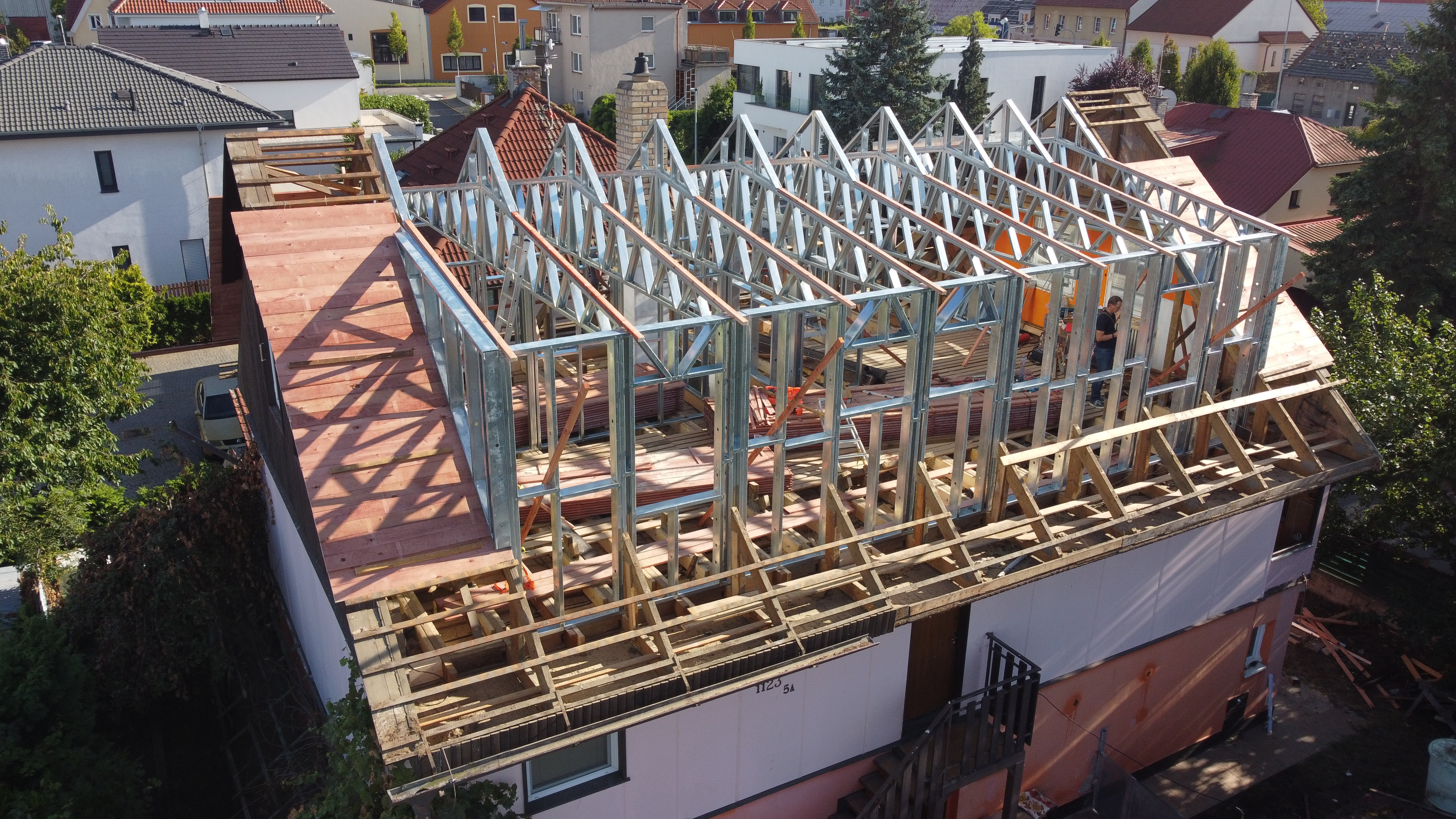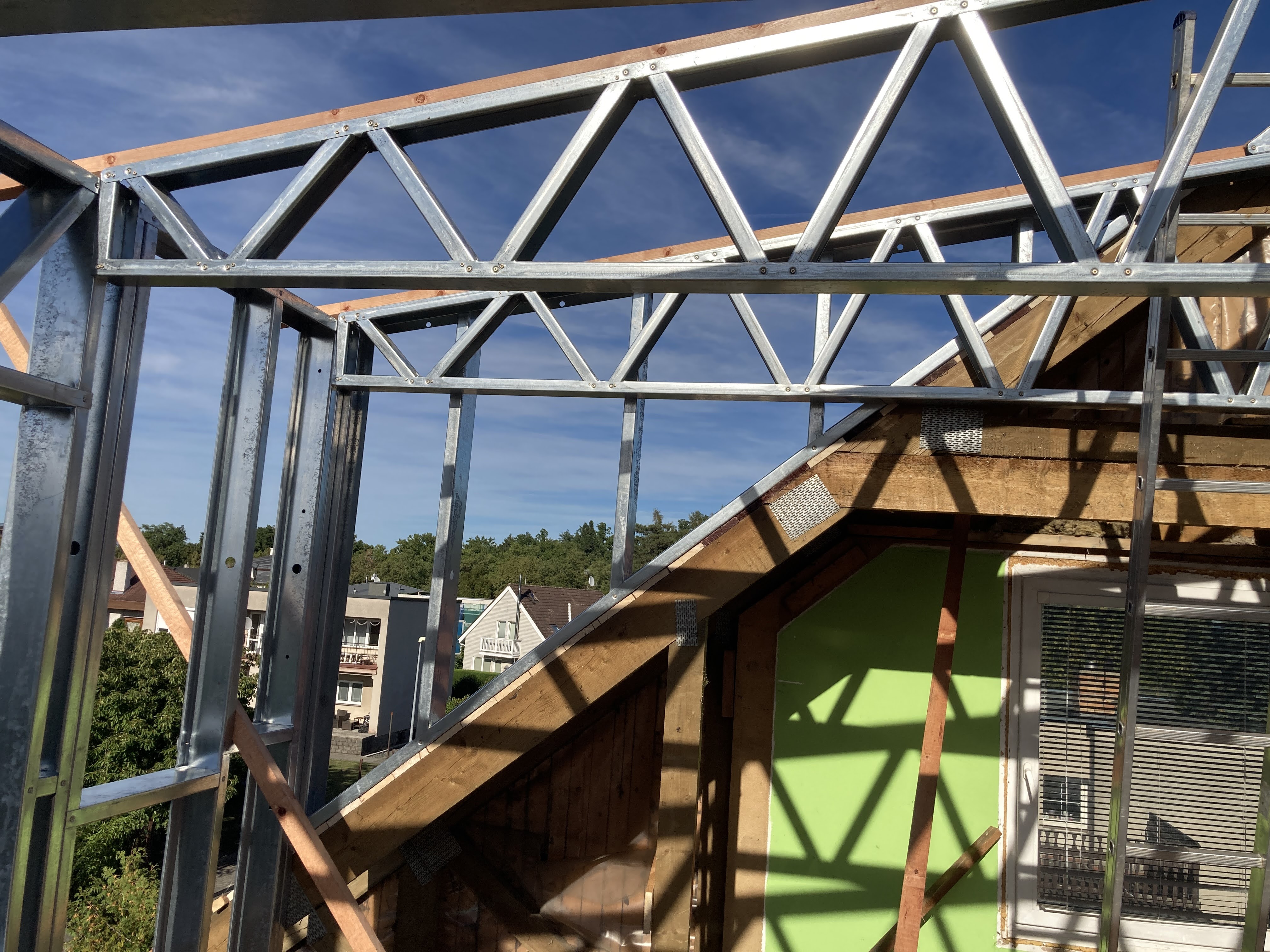Nástavba podkroví (3.NP) se sedlovou střechou a dvěma vikýři na RD typu Okál v Praze – Kunraticích. Rozměr nástavby je 8,1×13 m s vikýři délky 11 m a respektuje nosný systém stávajícího 2.NP, který je ze sloupkového systému s roztečí sloupků 1,2 m. Požadavkem bylo, aby byla nástavba „vložena“ mezi krajní původní dřevěné vazníky podkroví (které zůstaly zachovány) a tvarově se jim v hřebenové části přizpůsobila. Nástavba z tenkostěnných ocelových profilů systému Borabela je vytvořena stěnovým systémem obvodových a stabilizačních vnitřních stěn se střešními příhradovými vazníky sedlového tvaru s námětky, které ze střechy vikýře přecházejí tvarově do sedlové střechy. Obvodové stěny jsou sestaveny z profilů C150 s roztečí 625 mm, vnitřní stěny a příhradové vazníky z profilů C100. Vazníky jsou umístěny tak, aby jejich podpůrné sloupky ve stěnách navazovaly prostorově na stávající sloupky 2.NP a zatížení od střechy tak bylo přenášeno přímo do spodní konstrukce. Při realizaci bylo nutné dobře koordinovat odstranění původního krovu v rozsahu nové konstrukce a montáž konstrukce nástavby tak, aby nedošlo k neúměrně dlouhému odkrytí stavby a nezvyšovalo se tak riziko zatečení. Dosáhlo se toho předmontáží stěn a vazníků na zemi a následně, během jednoho a půl dne za pomoci jeřábu, se konstrukce osadily a zajistily před deštěm.
