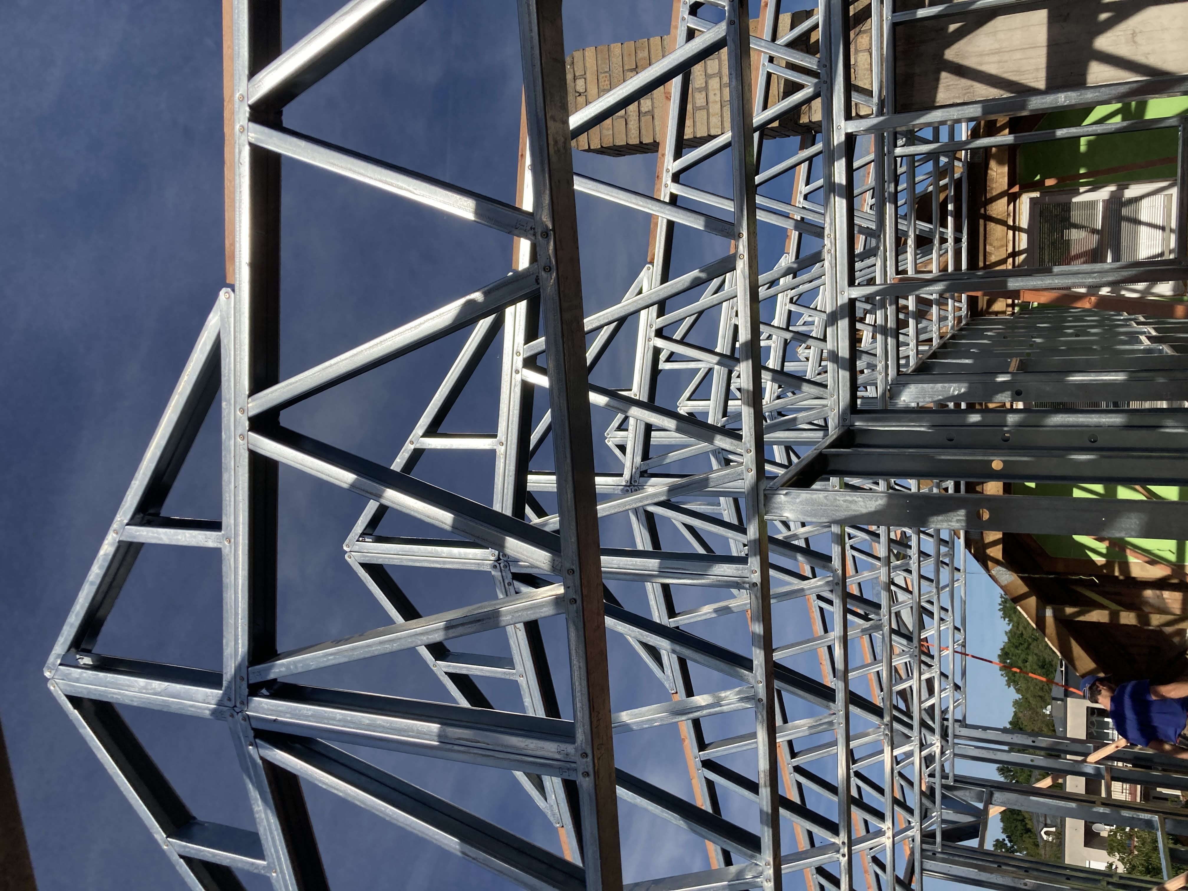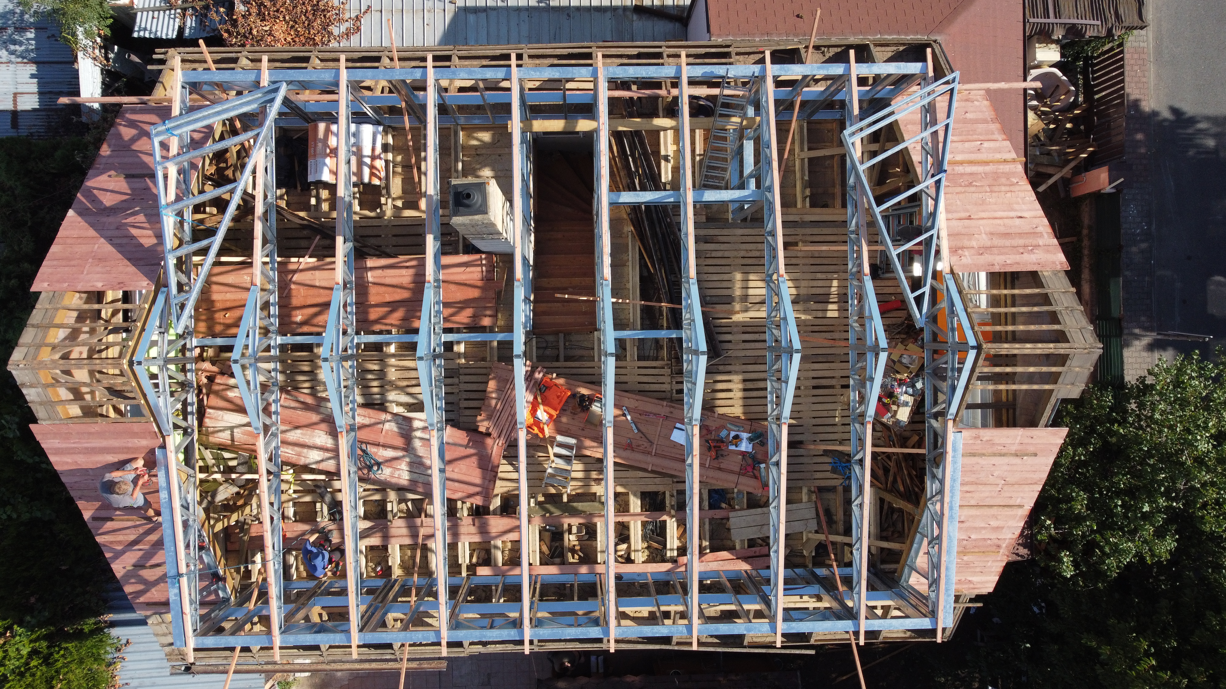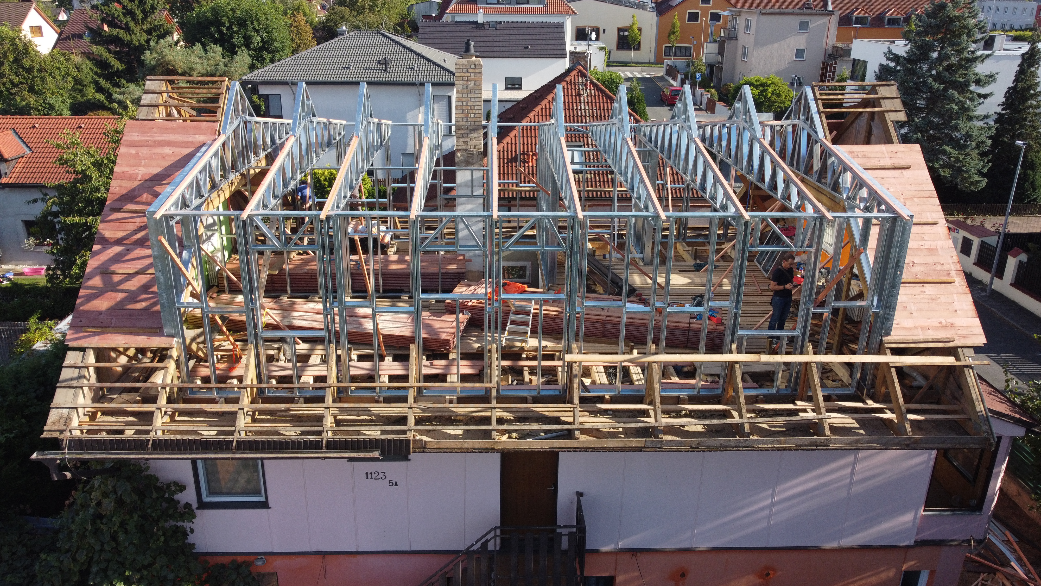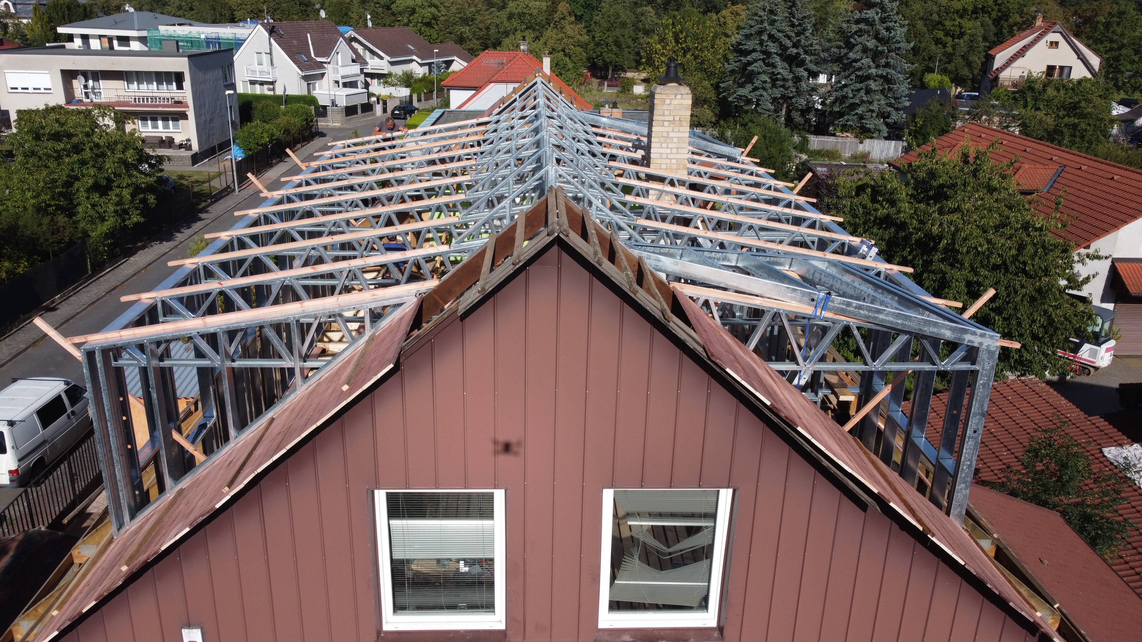 Nástavba podkroví (3.NP) se sedlovou střechou a dvěma vikýři na RD typu Okál v Praze – Kunraticích. Rozměr nástavby je 8,1×13 m s vikýři délky 11 m a respektuje nosný systém stávajícího 2.NP, který je ze sloupkového systému s roztečí sloupků 1,2 m. Požadavkem bylo, aby byla nástavba „vložena“ mezi krajní původní dřevěné vazníky podkroví (které zůstaly zachovány) a tvarově se jim v hřebenové části přizpůsobila. Nástavba z tenkostěnných ocelových profilů systému Borabela je vytvořena stěnovým systémem obvodových a stabilizačních vnitřních stěn se střešními příhradovými vazníky sedlového tvaru s námětky, které ze střechy vikýře přecházejí tvarově do sedlové střechy. Obvodové stěny jsou sestaveny z profilů C150 s roztečí 625 mm, vnitřní stěny a příhradové vazníky z profilů C100. Vazníky jsou umístěny tak, aby jejich podpůrné sloupky ve stěnách navazovaly prostorově na stávající sloupky 2.NP a zatížení od střechy tak bylo přenášeno přímo do spodní konstrukce. Při realizaci bylo nutné dobře koordinovat odstranění původního krovu v rozsahu nové konstrukce a montáž konstrukce nástavby tak, aby nedošlo k neúměrně dlouhému odkrytí stavby a nezvyšovalo se tak riziko zatečení. Dosáhlo se toho předmontáží stěn a vazníků na zemi a následně, během jednoho a půl dne za pomoci jeřábu, se konstrukce osadily a zajistily před deštěm.