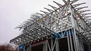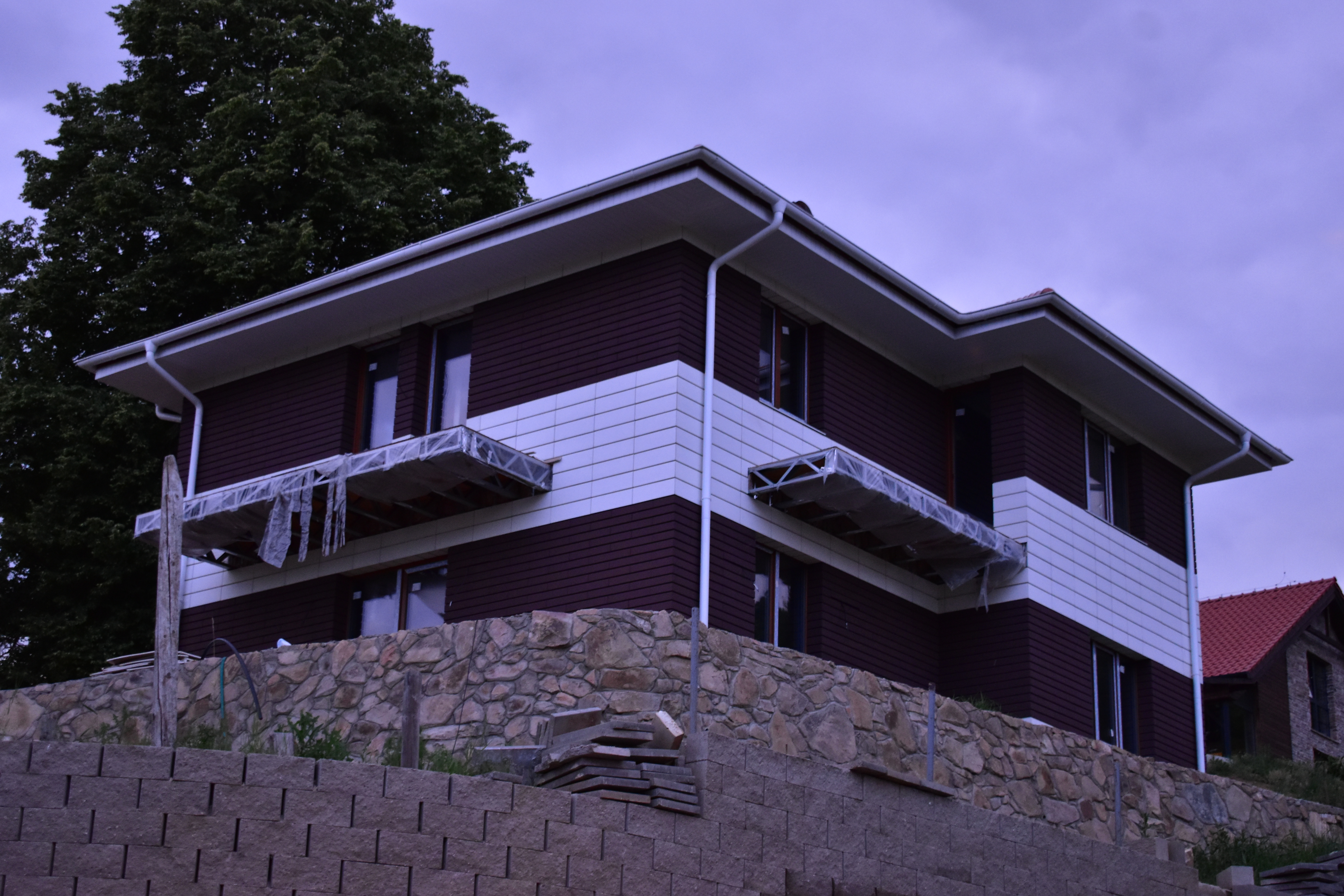 Další dům opláštěný systémem Scanroc. Poradili jsme si s balkonem, terasou s převisem, schodištěm i tvarově složitější střechou.