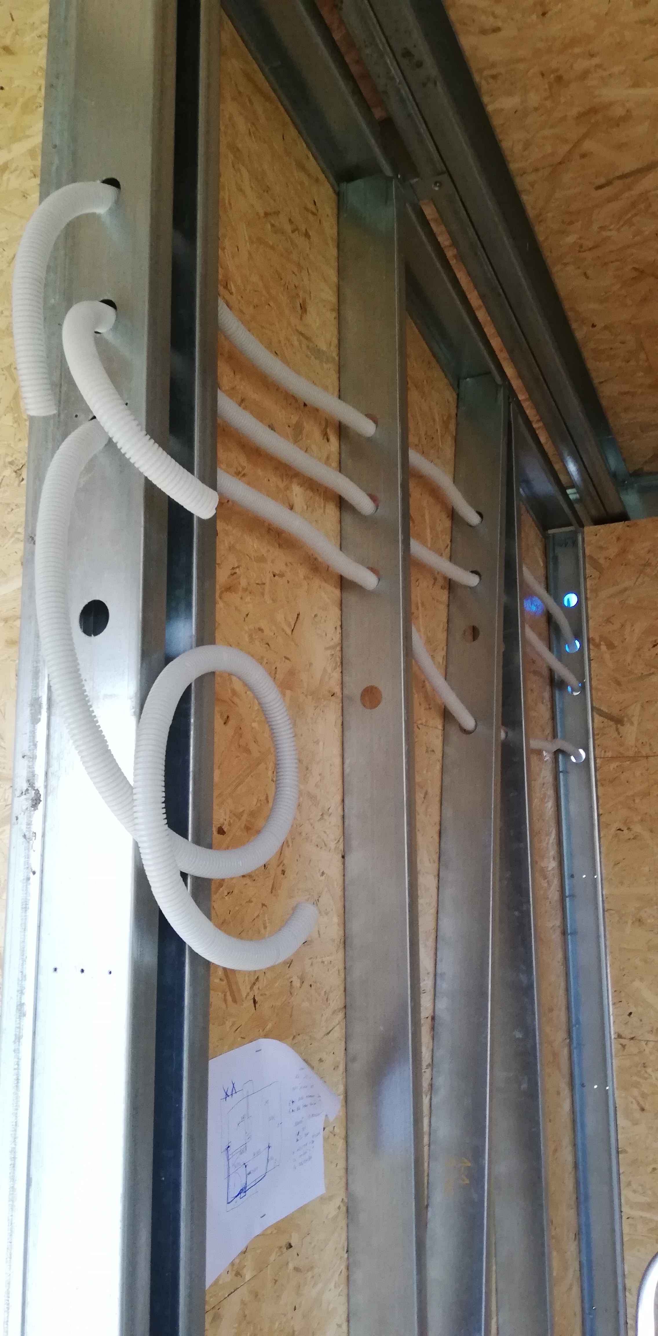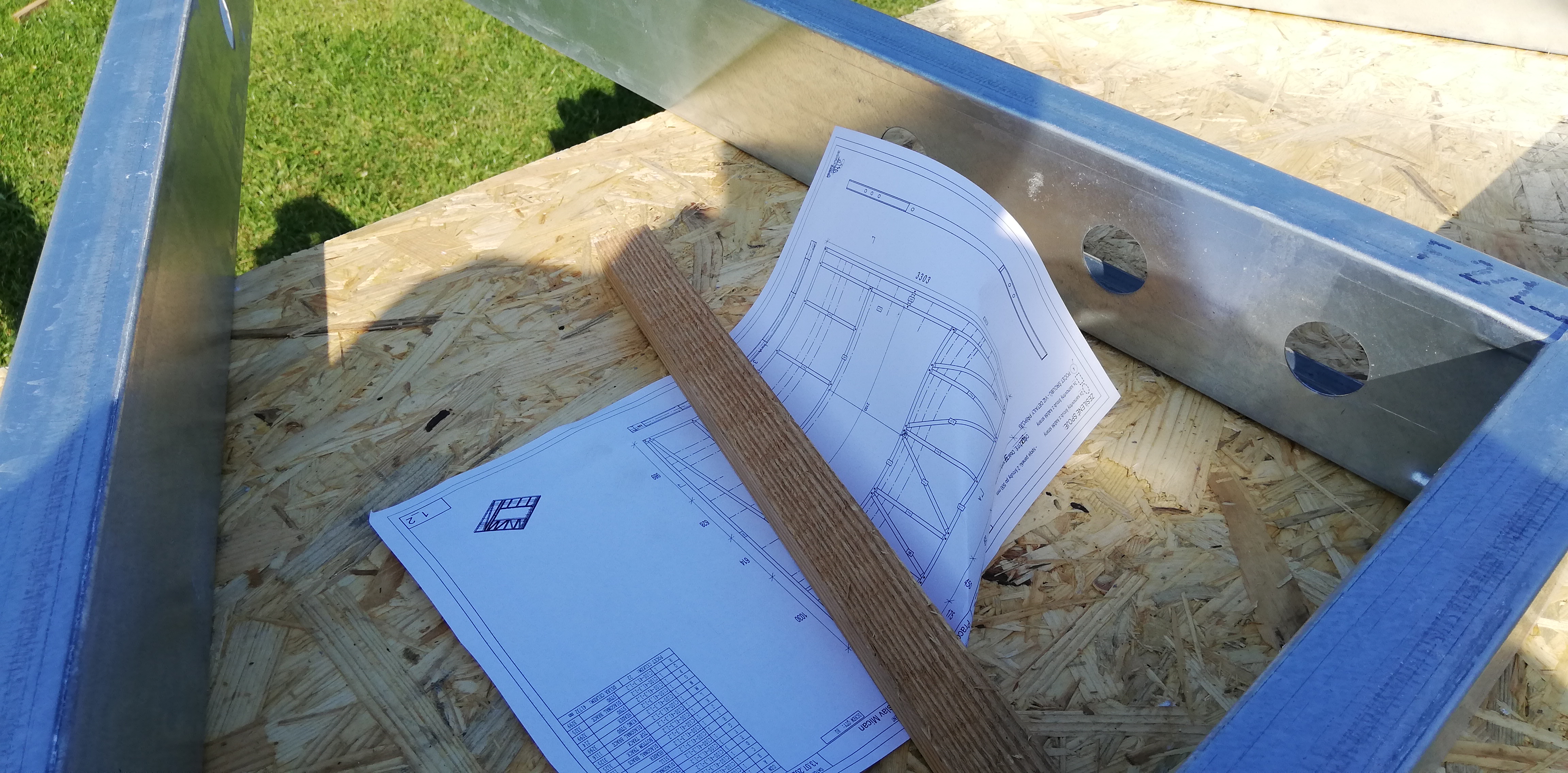 Konstrukce garáže a dílny určená k opláštění sendvičovými panely, z interiéru SDK. Velikost vrat 2,5 x 2,5 m.